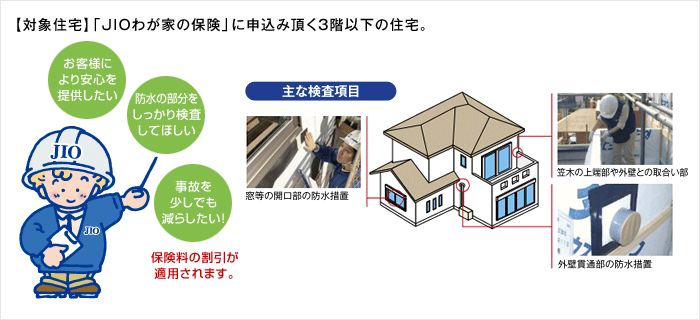「JIOわが家の保険」と建設住宅性能評価を同時に申し込むことで、保険料・検査料とも割引きになります。